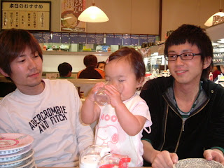 Great Grand parents, Uncle Mako, Satoshi ( mama's cousin) and mama & myself went to the sushi place! Of course, I couldn't get to eat *sushi*, but I ate so much rice, cooked egg, cooked seafoods...etc.! Ate too much! Love, Miyu